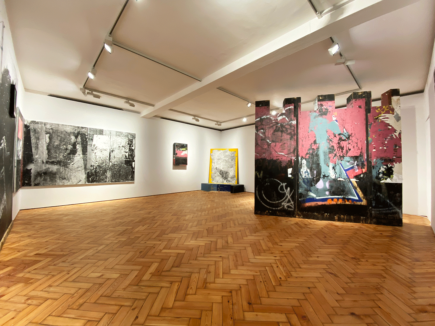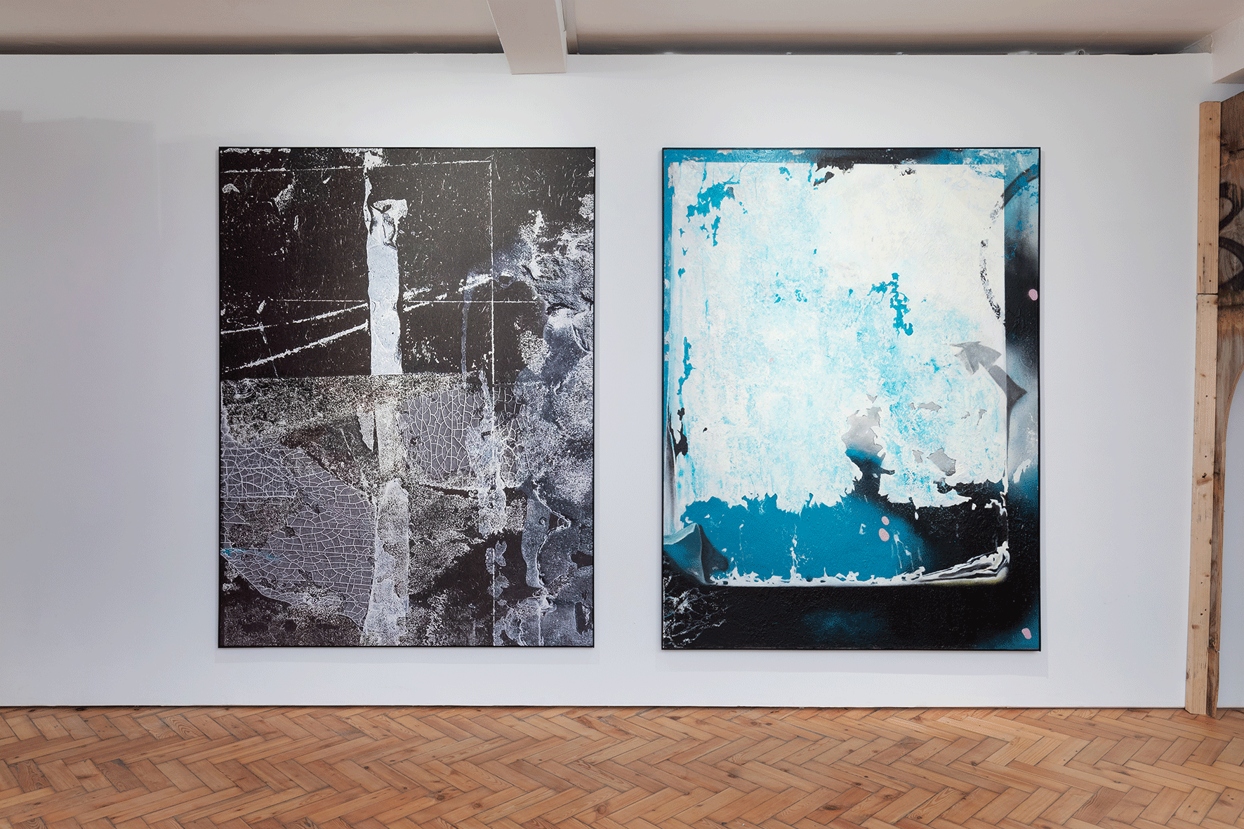 Dark Patterns 2024, digital latex on canvas. Shadow Ban 2024, Oil, spray paint on canvas both 200x150cm